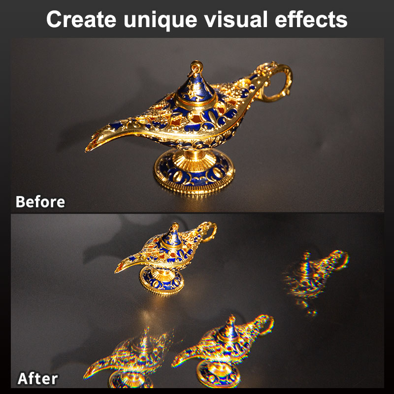 Our Handheld Split Prism Kaleidoscope Filter is designed for both amateur and professional photographers. The handheld feature allows you to effortlessly adjust the angle and distance, giving you control over the intensity and placement of effects.